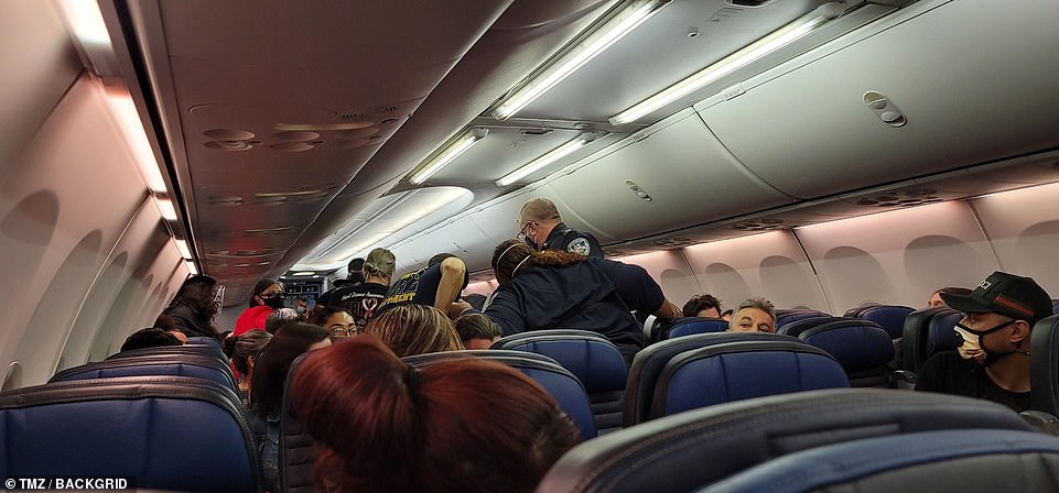 ‘There was no chaos on board. The photos look like it but that’s because there were a lot of people in one spot in a small space. Just like when boarding a flight, it’s organized but a photo will make it look like a mob. The flight crew had everything under control to the best of their ability and any passenger that was not actively helping was sitting calmly in their seats. I’ve been in chaotic situations before and that was absolutely not the case. It definitely could have been, but the flight crew did an amazing job.’